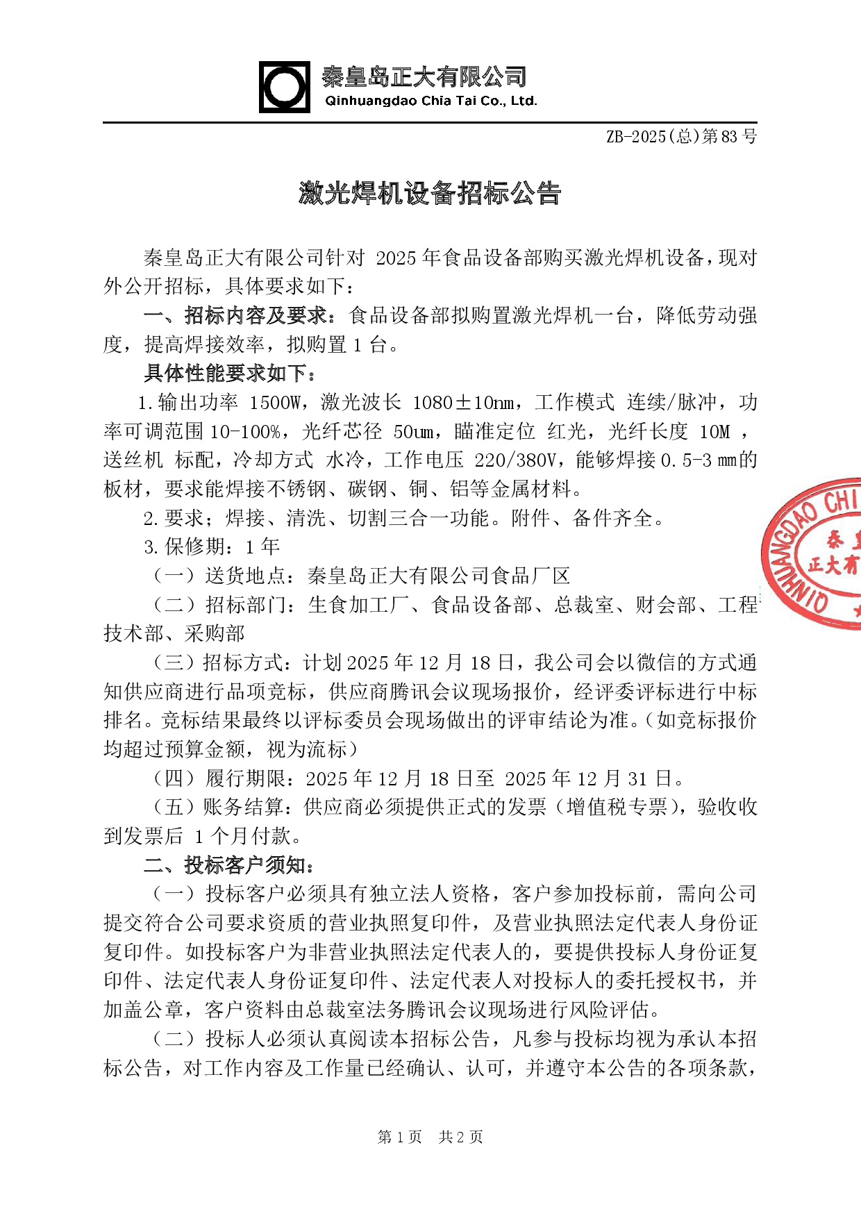 激光焊机设备招标公告
