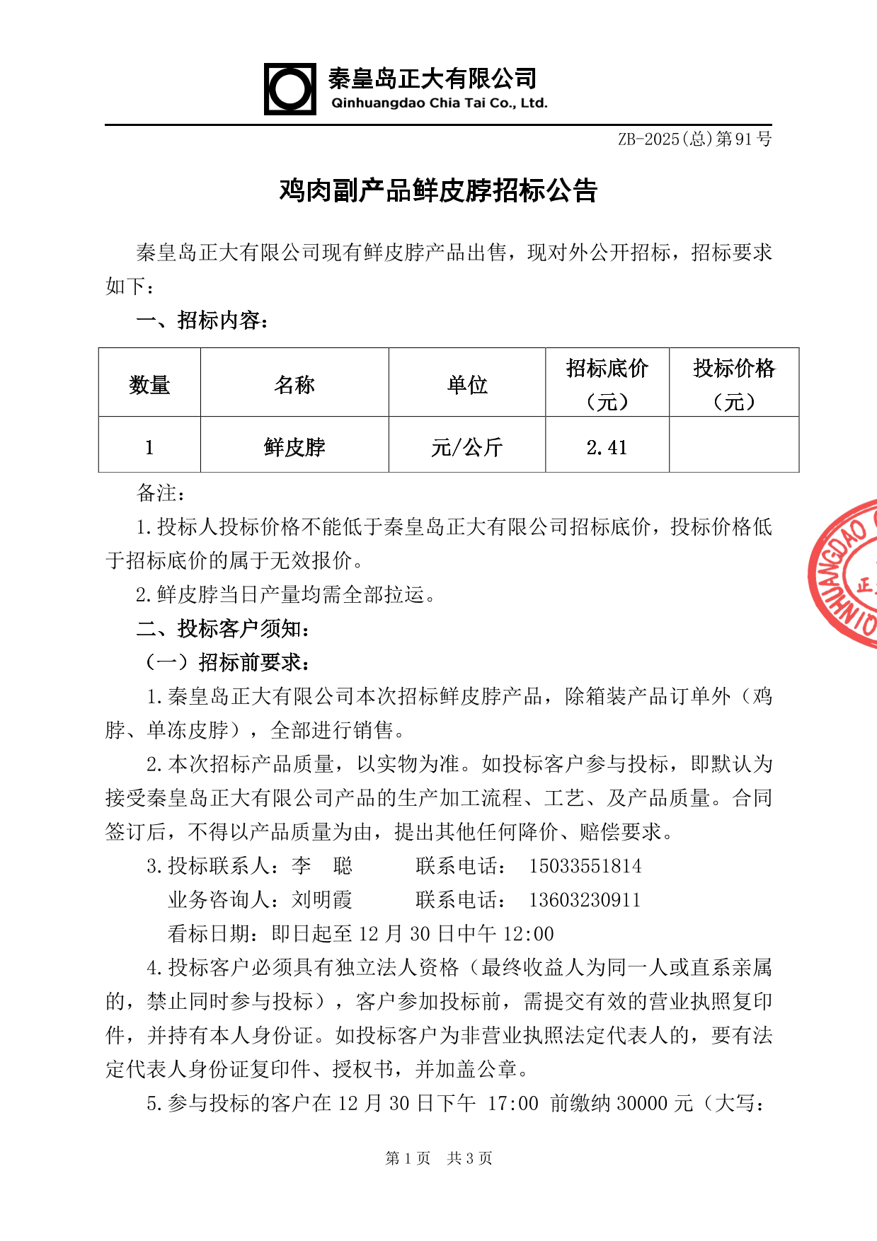 鸡肉副产品鲜皮脖招标公告